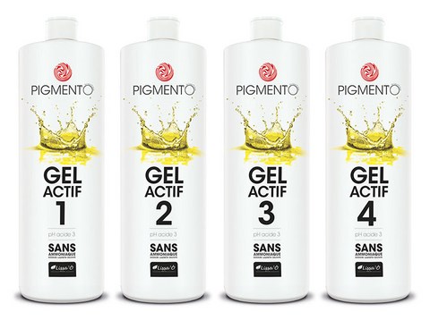 Les gels actifs Pigmento contiennent une faible concentration d’eau oxygénée dont le rôle est d’ouvrir les 4 à 6 premières couches d’écailles pour y polymériser les pigments. Ils sont certifiés sans ammoniaque, sans SLS (Sodium Laureth Sulfate) et avec un Ph acide de 3 environ.